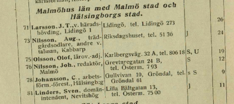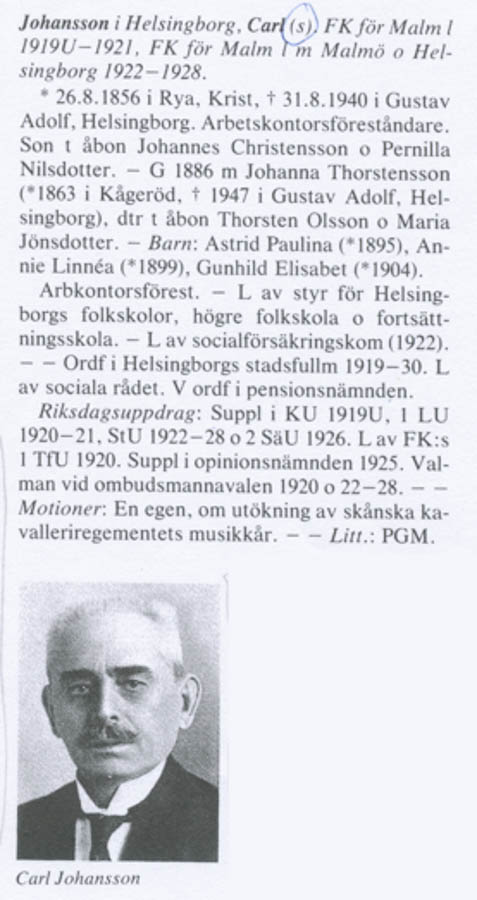 Jag besökte Riksdagens bibliotek på Storkyrkobrinken för att läsa om Carl och om möjligt se vad han hade uträttat i riksdagsarbetet för sin stad. Där fann jag en bild och lite data om honom och hans tid som riksdagsman. Han har tillsammans med sina riksdagskolleger lämnat in ett antal motioner men bara en egen, den om utökning av skånska kavalleriregementets musikkår.