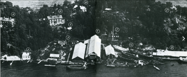 Förklaringar till byggnaderna på Sätra varv: 1 Pråmbyggnadskjul och stapelbädd, 2 Sliprar, 3 Såg och ångmaskin, 4 Bostadshus för varvsarbetare, 5 Bostadshus 6 Tvättstuga, 7 Mangelbod