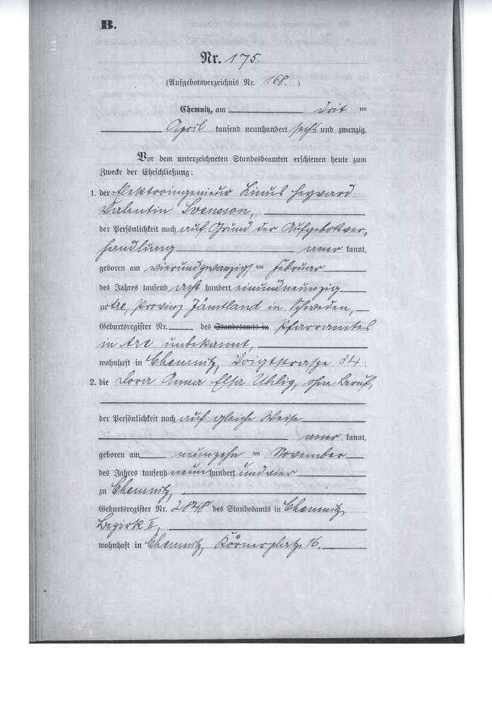 Jag hade hoppats att hitta journaler på min farmor men icke, så jag fick skriva till stadsarkivet i Chemnitz och fick ut bra papper på min farmors familj. Jag fick födelseregister på min farmor och hennes systrar samt äktenskapsregister på farmors föräldrar och systrarna och farmor och farfar och även dödsregister på min farmors föräldrar och systrar.