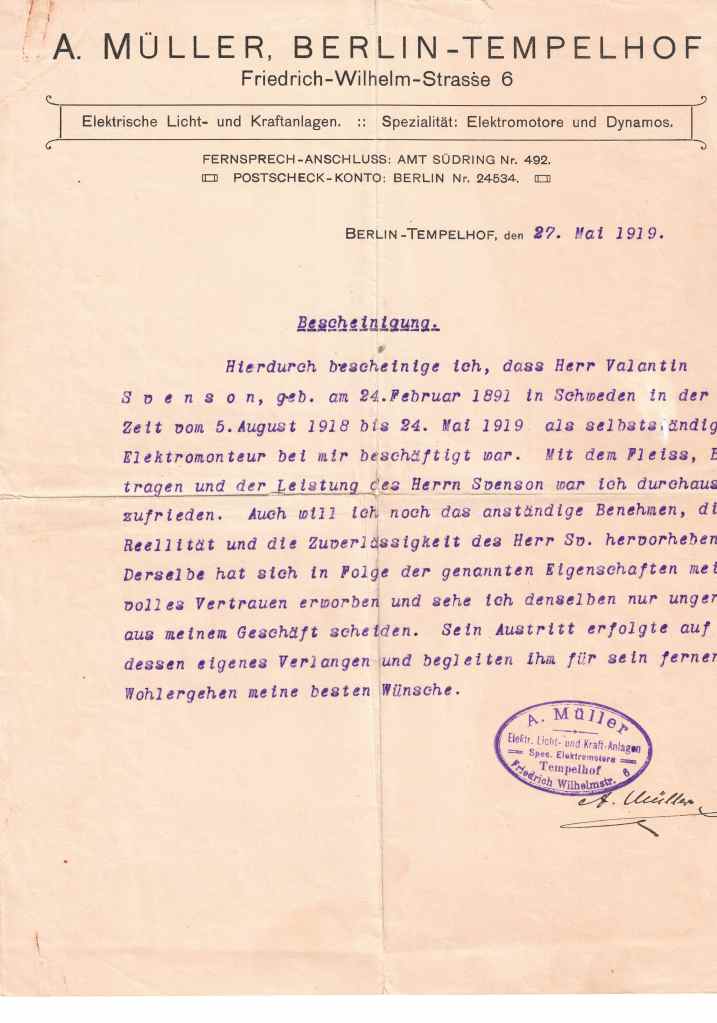 Efter Siemens blev det A.Müller i Berlin-Tempelhof mellan 1918-1919.