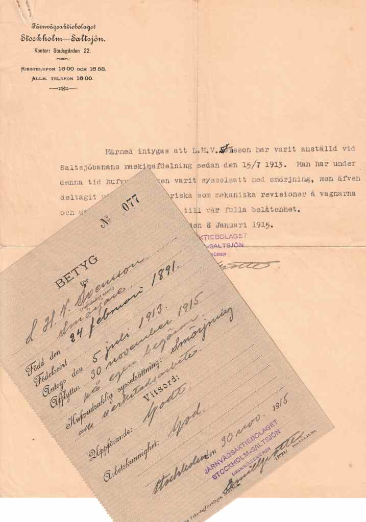 Min farfar flyttar till Stockholm 1912 och jobbar som handelsbiträde mellan 1912–1913 i juni. Det är det enda betyg vi saknar. 1913 flyttar han till Saltsjöbaden och börjar arbeta på Saltsjöbanan som vagnssmörjare, precis som sin far, men 1914 i februari åker han upp och ordnar med sin fars bouppteckning.