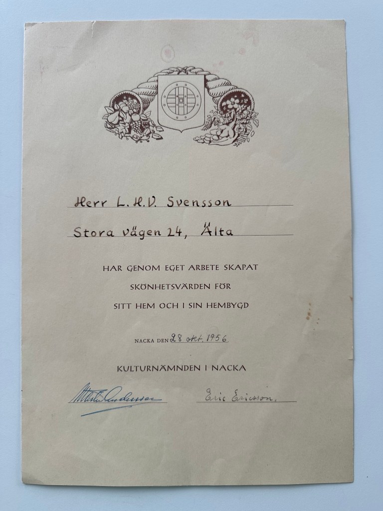 Här bor min farfar hela sitt återstående liv. De odlar och sköter om sin trädgård, köper möbler på NK och lever gott. De vinner en tävling om vackraste trädgården i Nacka 1950. Min pappa fick arbeta hårt i trädgården efter skolans slut.