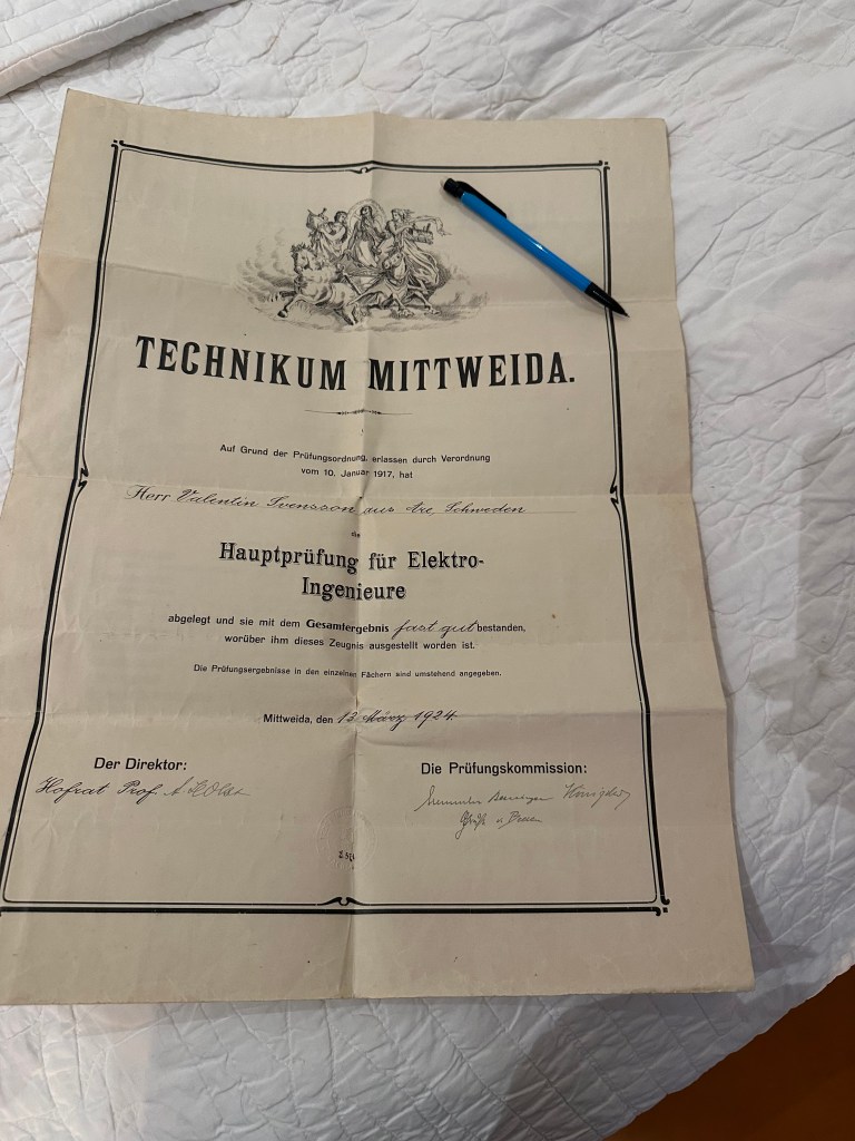 Den 13 mars 1924 tar han sin ingenjörsexamen i Mittweida Tyskland. Examensbrevet är enormt i A3-format. Så ståtligt. Som ett annonsblad.