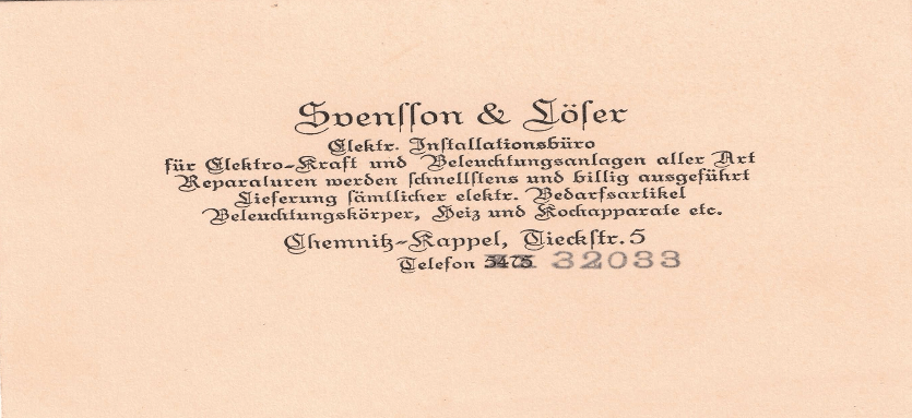 1924/25 träffar min farmor Elsa sin man den blåögde blonde svensken Linus Heyward Valentin Svensson. Elsa arbetade i en grammofonaffär. Min farfar Valle besökte denna affär mer än en gång kan jag tänka. De gifter sig 1926. Tre år bor de i Chemnitz innan de 1929 tar steget att flytta till Sverige.