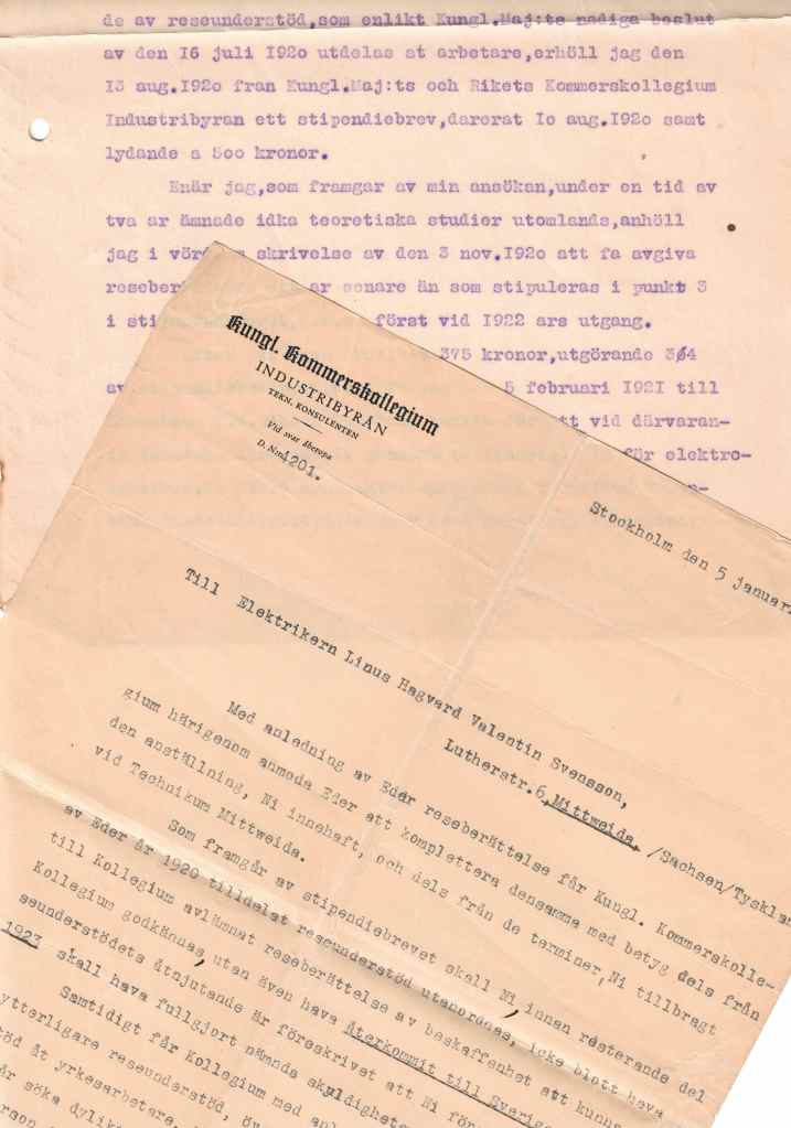Det beviljas i ett brev i juli 1920 och i augusti 1920 blev han lovad 500 kr i stipendium. Februari 1921 efter att ha fått 375 kr av det utlovade beloppet reser min farfar till Tjeckoslovakien och Bodenbach och dess tekniska läroanstalt.