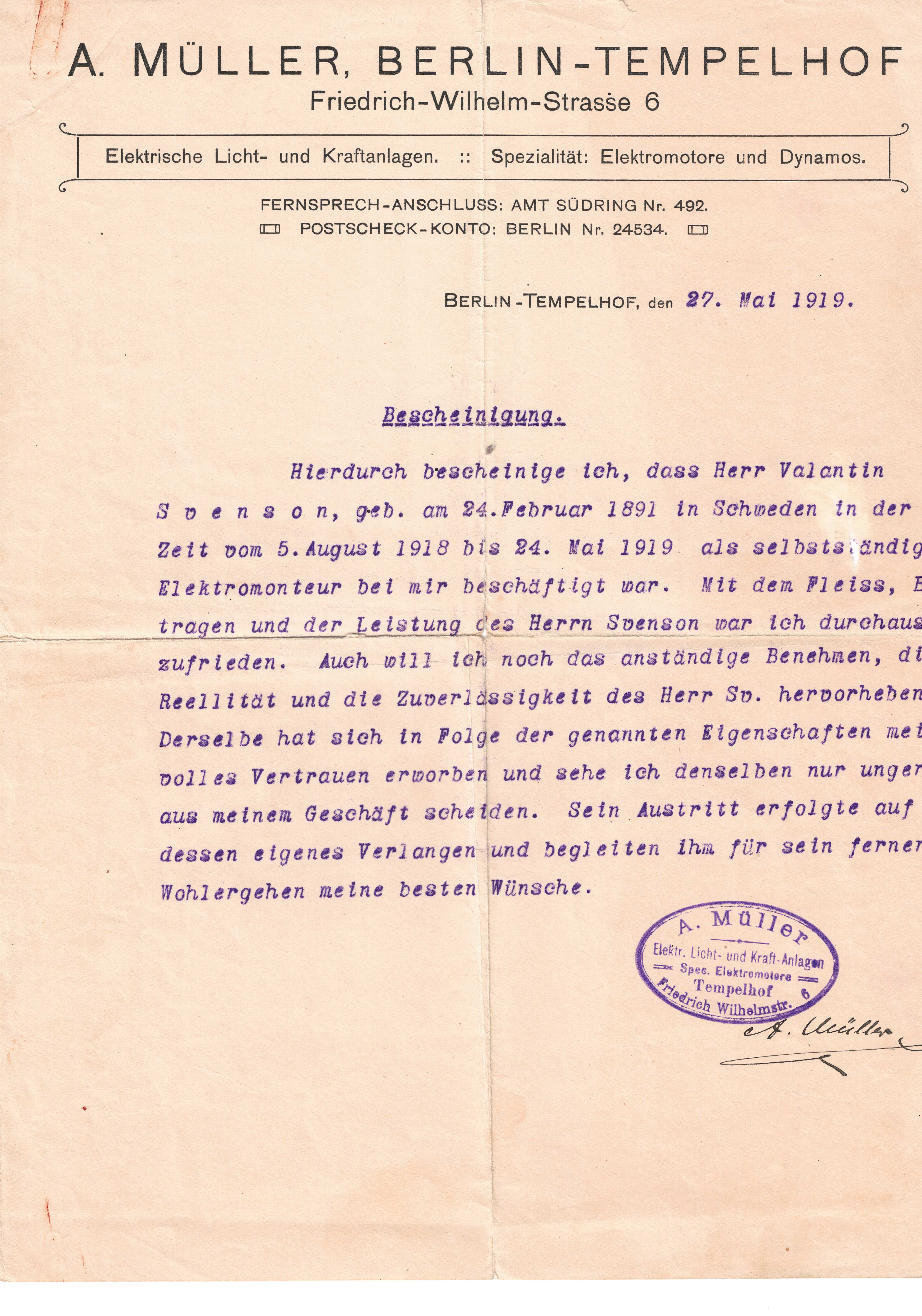 Arbetsintyg från A. Müller