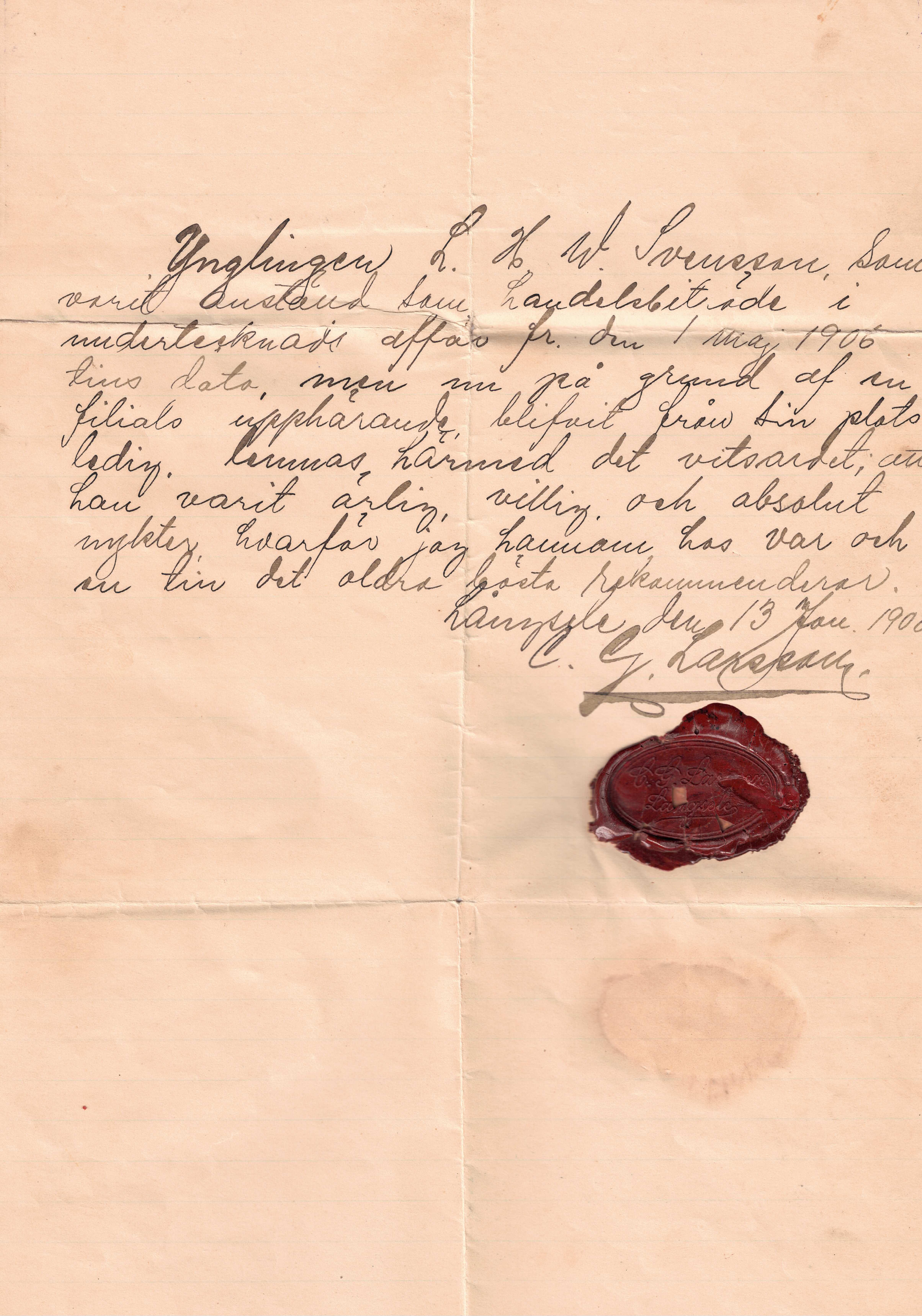 Farfars arbetsbetyg när han slutade hos bagare Larsson