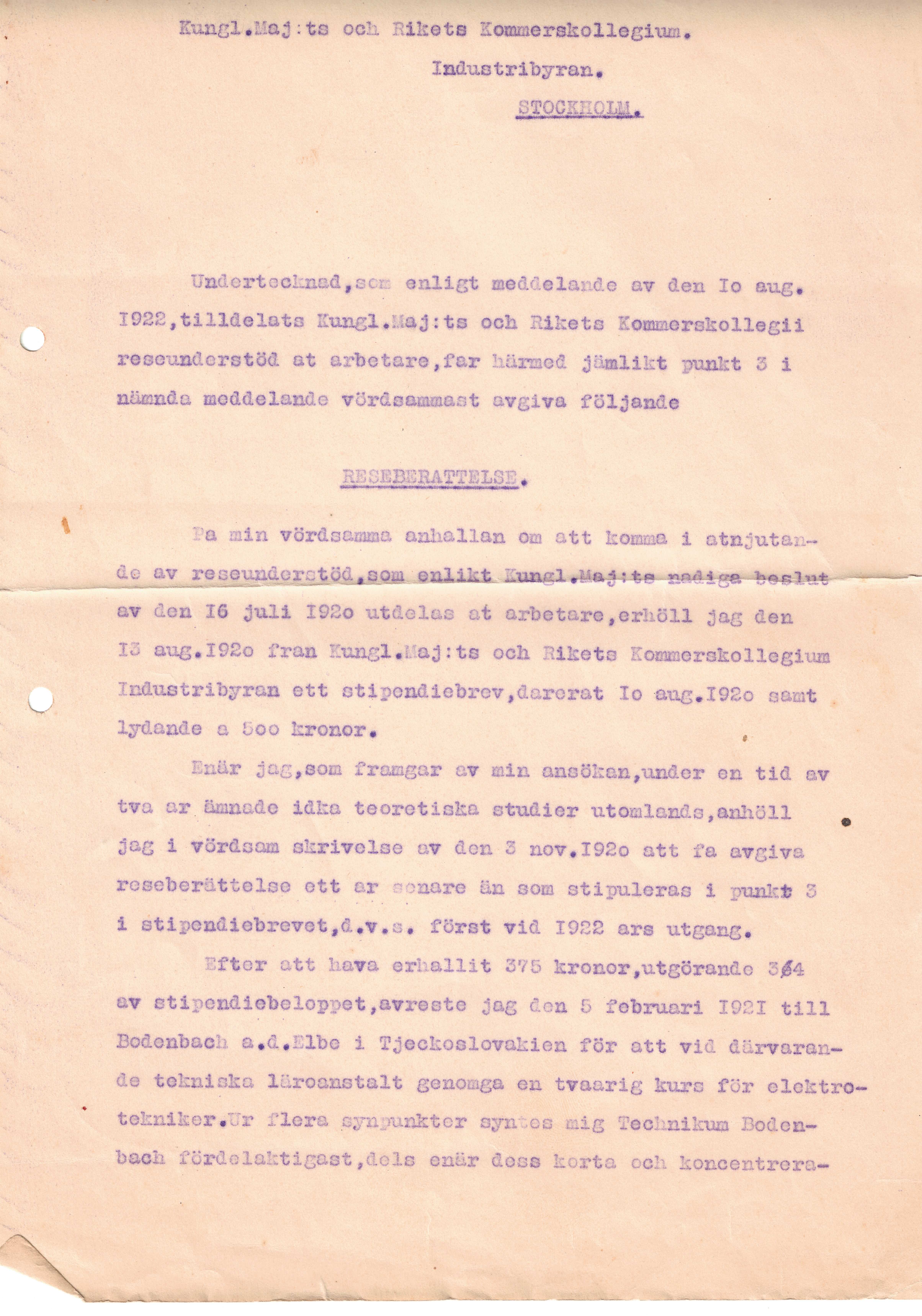 Det beviljas i ett brev i juli 1920 och i augusti 1920 blev han lovad 500 kr i stipendium. Februari 1921 efter att ha fått 375 kr av det utlovade beloppet reser min farfar till Tjeckoslovakien och Bodenbach och dess tekniska läroanstalt.