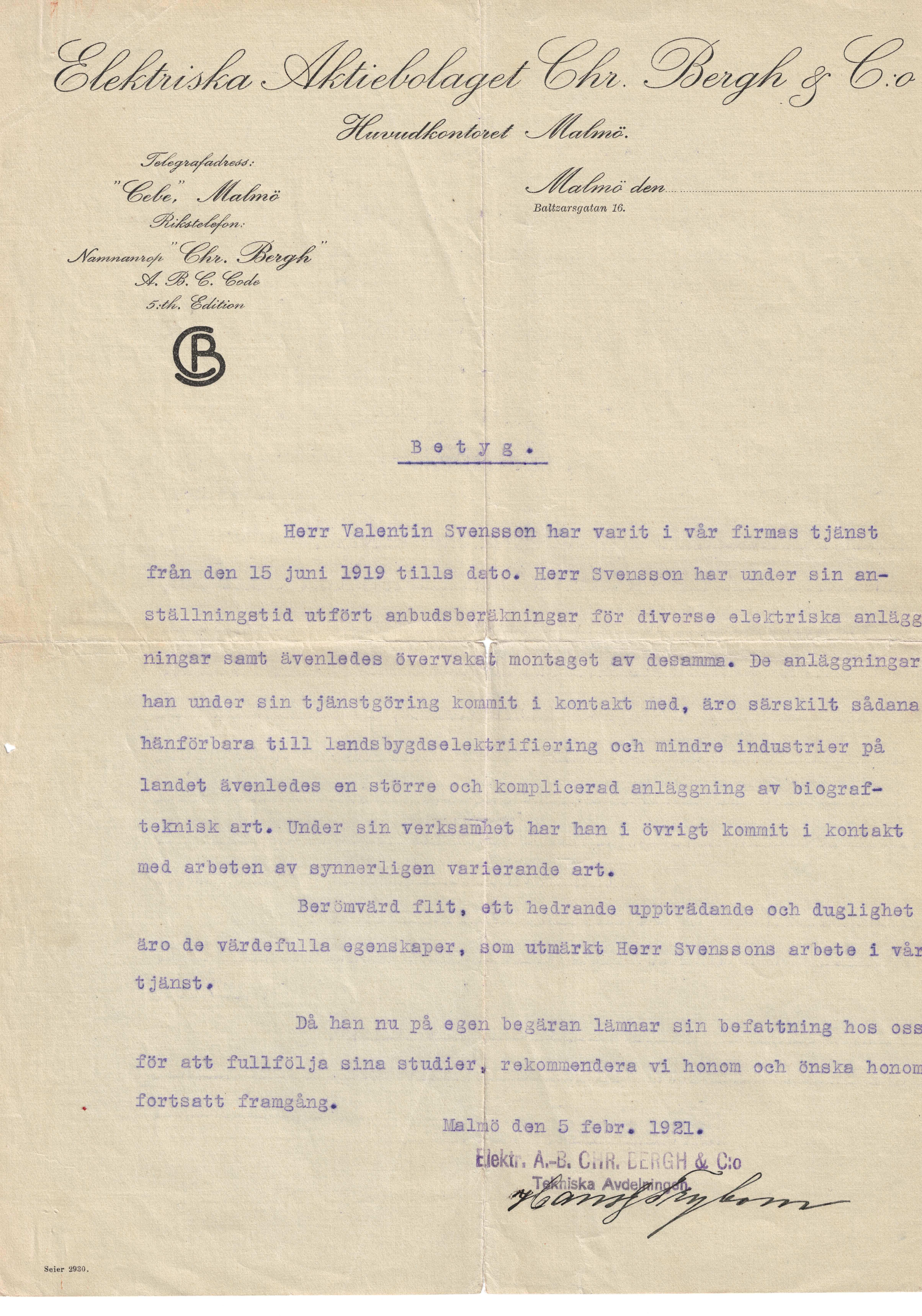 Arbetsbetyget från Chr. Berg & Co i Malmö