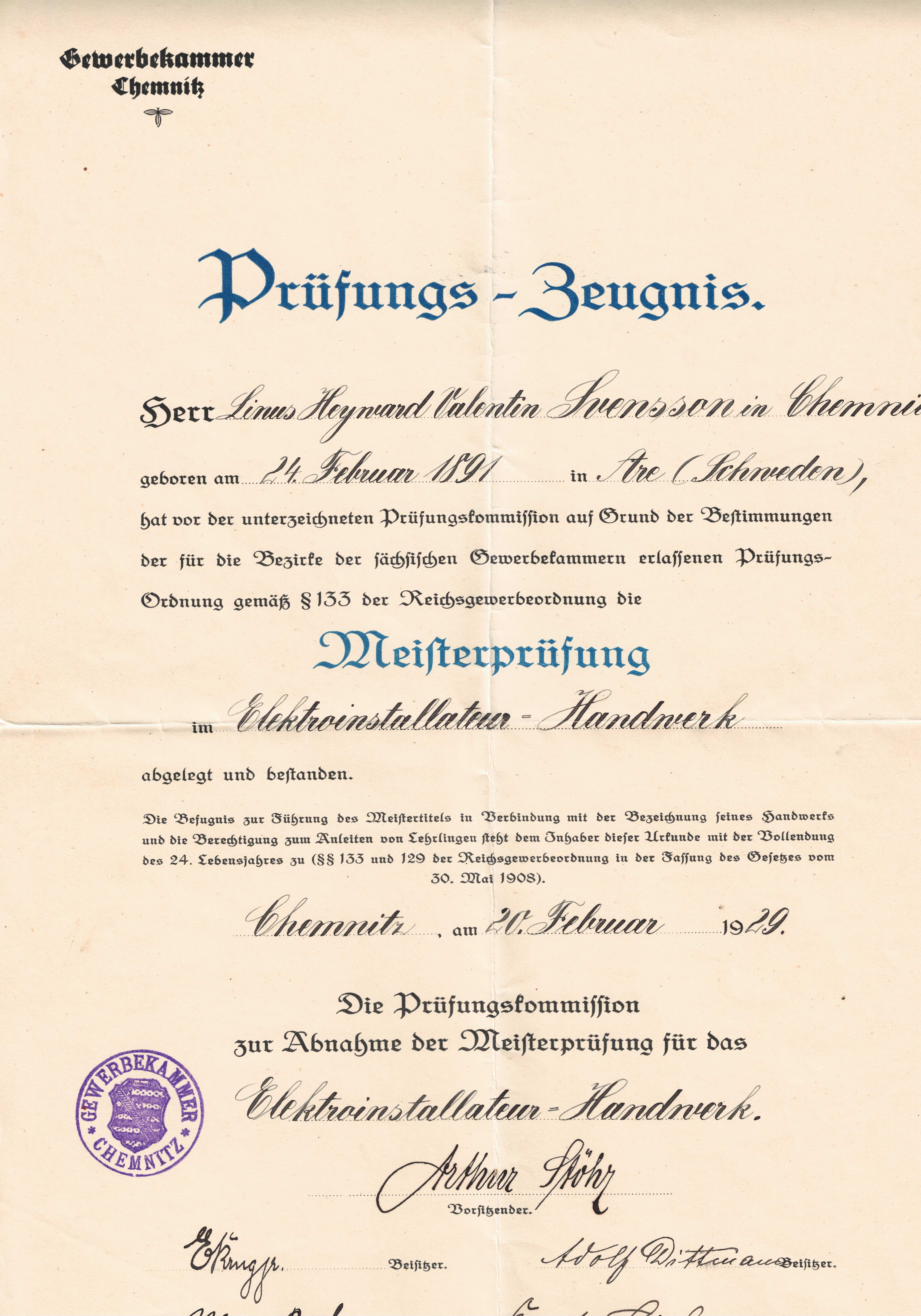 Inte slutar min farfar studera för 27 mars 1928 tar han examen i Chemnitz som elinstallatör och den 20 februari 1929 tar han en magisterexamen i elinstallatörhandel. Detta kröner min farfars utbildningsresa i Tyskland.
