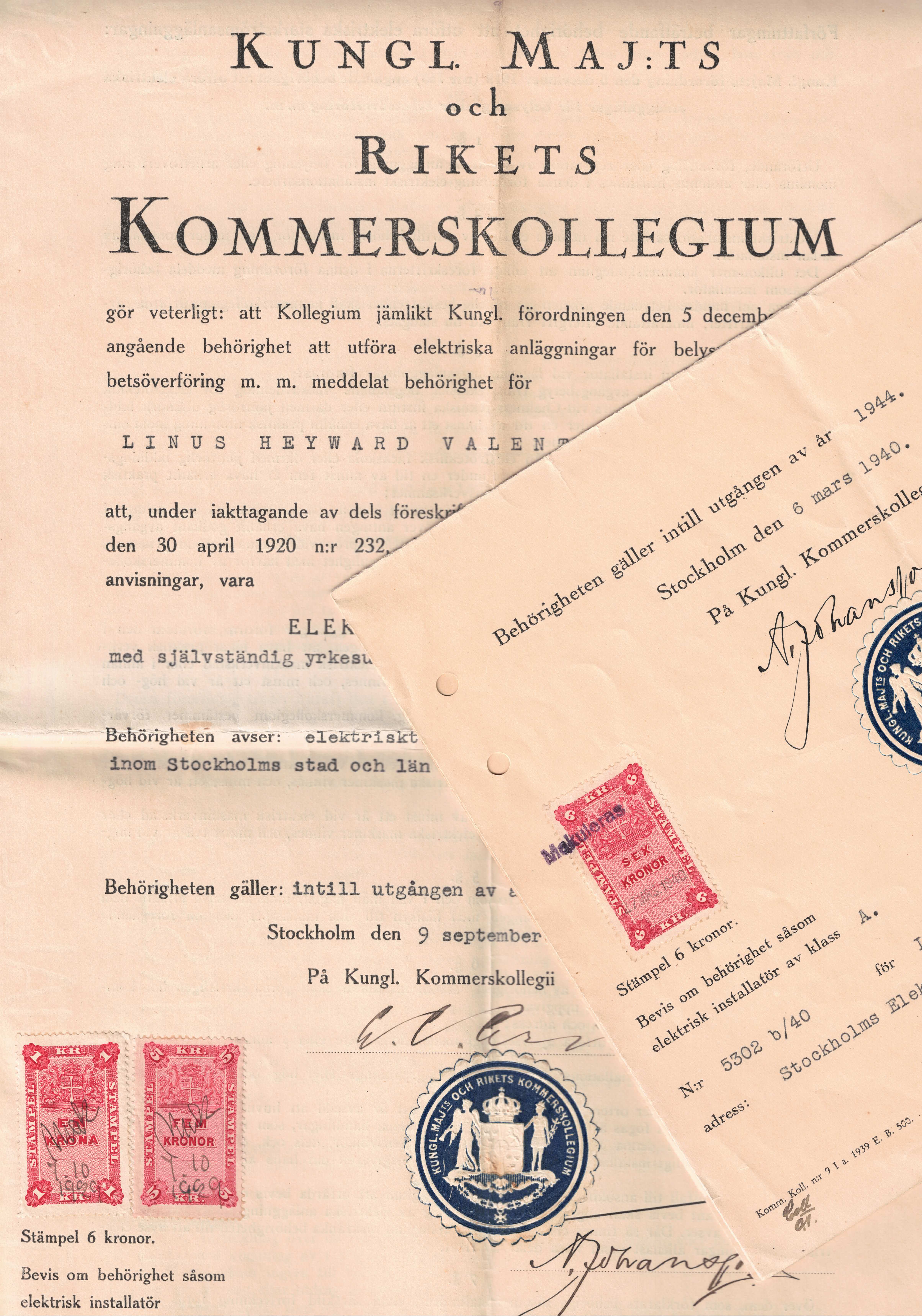 1929 i oktober är farfar tillbaka i Malmö. med sin tyska fru och flyttar till Lidingö Käppala, Kvarteret Stora Björn innan de kort där efter flyttar till Kungsholmen. Här söker han behörighet att verka som elinspektör hos kommerskollegium, han har två stora intyg.