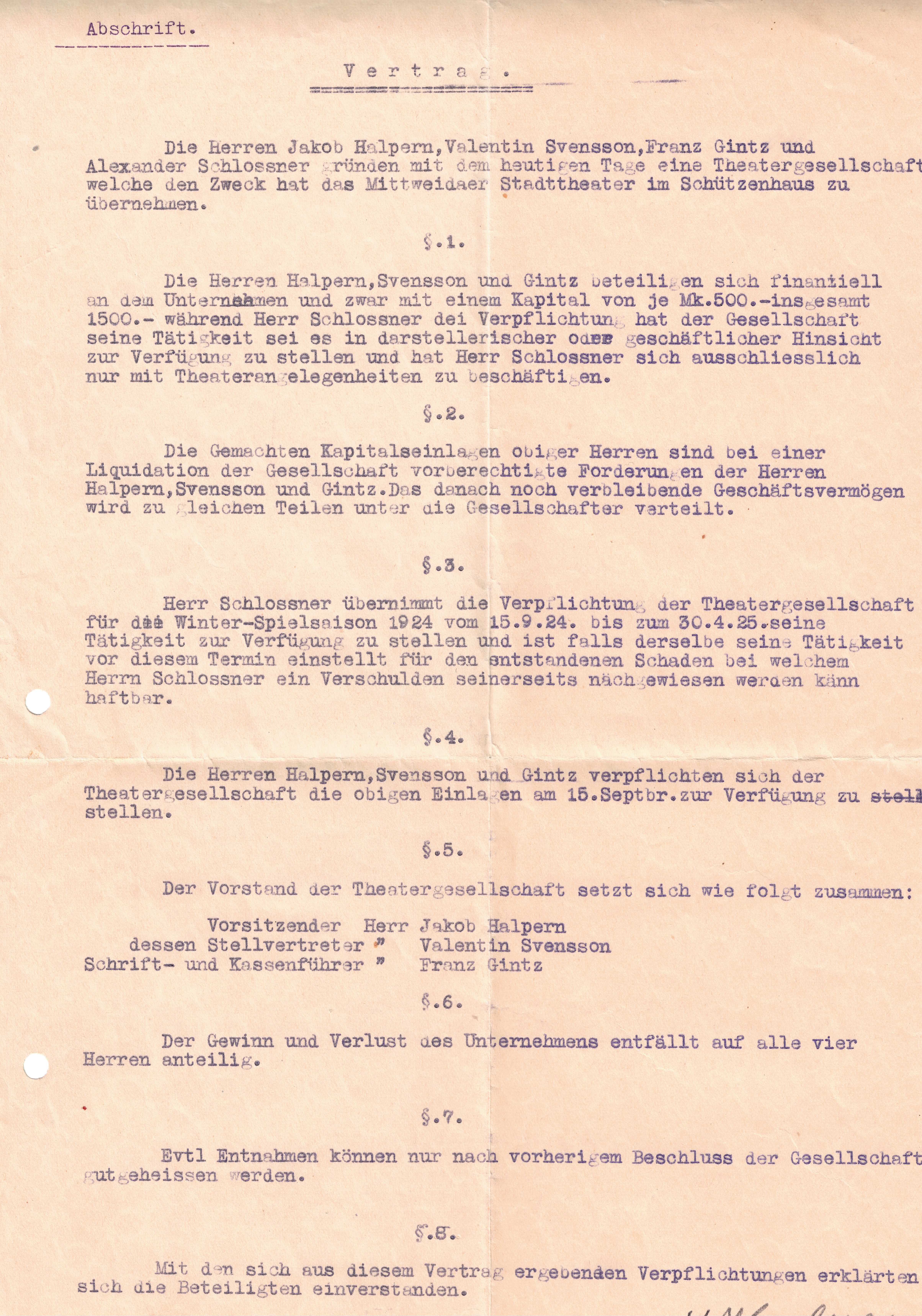 De är tre personer som lägger 1500 DM medan den fjärde kommer att verka för att driva teatern. Min farfar var andre ordförande. Hur det gick vet jag inte. Jag har skrivit till dem på teatern och frågat men tyvärr inte fått svar. Teatern finns ju kvar.