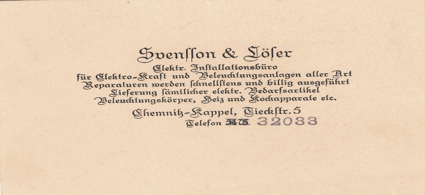 1924/25 träffar min farmor Elsa sin man den blåögde blonde svensken Linus Heyward Valentin Svensson. Elsa arbetade i en grammofonaffär. Min farfar Valle besökte denna affär mer än en gång kan jag tänka. De gifter sig 1926. Tre år bor de i Chemnitz innan de 1929 tar steget att flytta till Sverige.