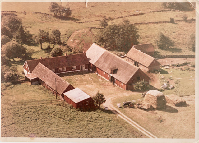 Flygfoto över gården Ljungseröd, då med öppna landskap, idag mitt i en mörk granskog. Källa: Arkiv Digital