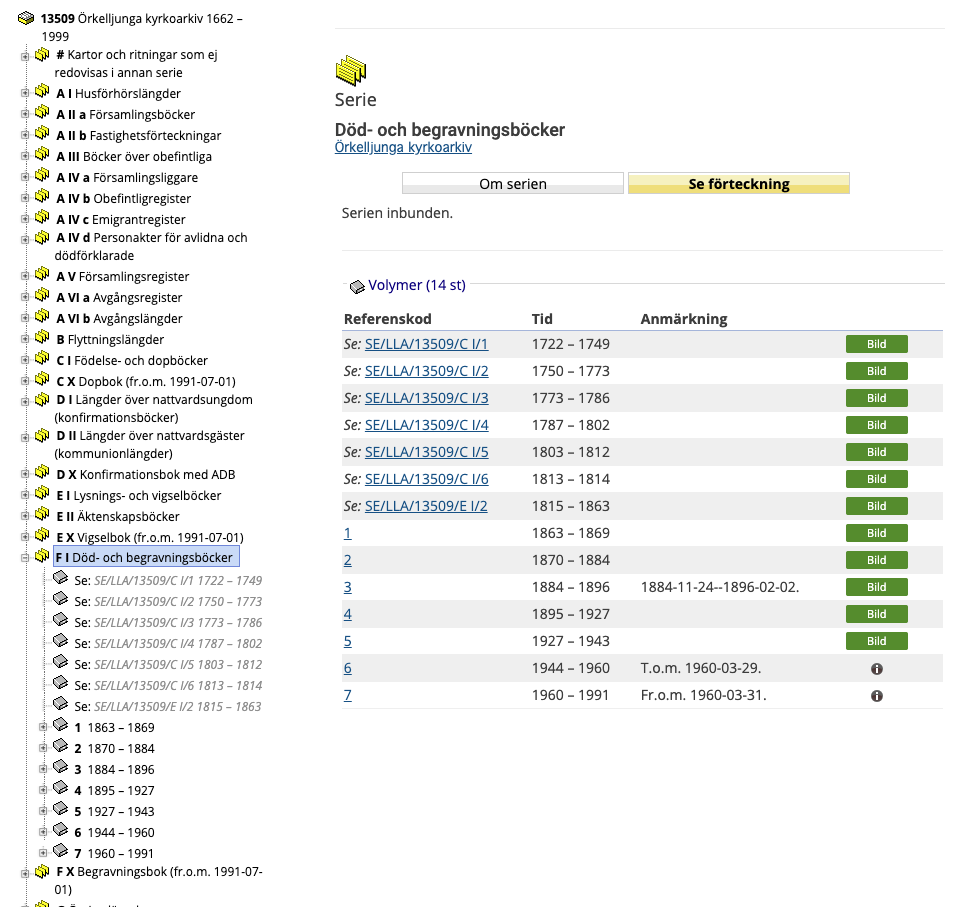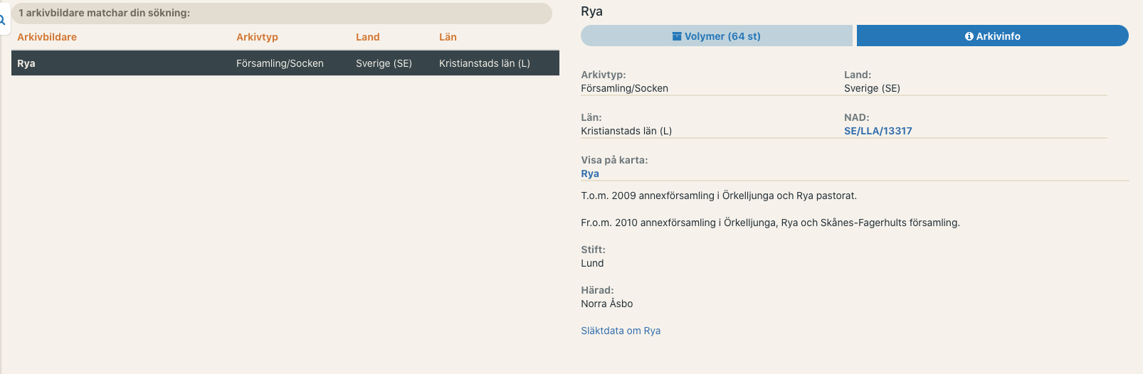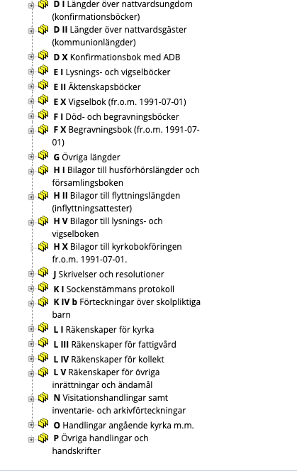 När du har valt Arkivinfo så får du en länk till NAD som visar allt material som finns i kyrkoarkivet för den valda församlingen både digitaliserat och icke digitaliserat.