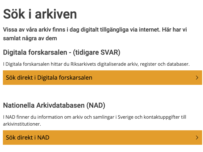 Det går alltid att gå in direkt i NAD via Riksarkivet genom att välja NAD i stället för Digitala forskarsalen under Sök i arkiven.