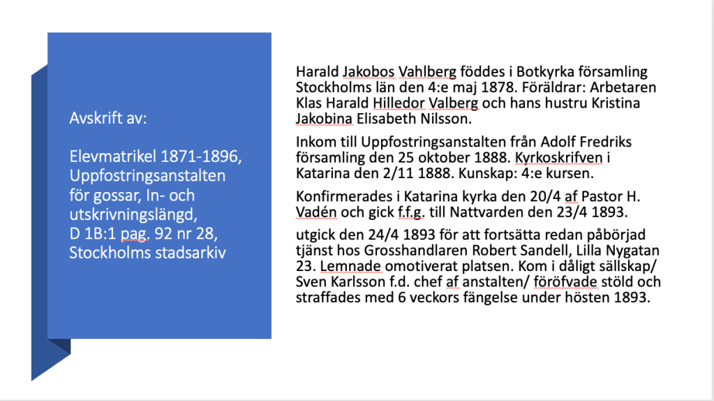 Jag besökte för ett antal år sedan Stockholms stadsarkiv och hittade en Elevmatrikel för anstalten. Enligt elevmatrikeln tas Harald in på anstalten den 25 oktober 1888 från sitt hem på Dalagatan i Adolf Fredriks församling. Han skrivs ut 1893 24 april, dagen efter sin konfirmation, och fortsätter arbeta för grosshandlaren R. Sandell på Lilla Nygatan 23 där han redan varit innan frisläppningen.