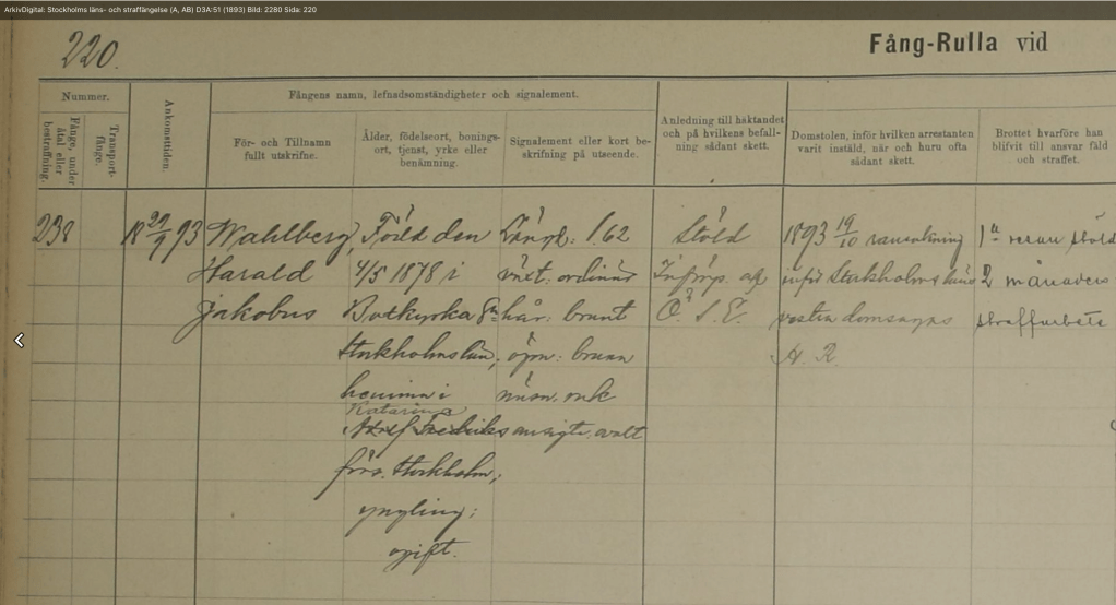 Numera finns många fängelsearkiv tillgängliga i Arkiv Digital så jag söker upp Stockholms stads länsfängelse under Arkivsökning. Här kallas det Stockholms stads län- och straffängelse och det finns både ett fängelsearkiv och ett kyrkoarkiv för detta fängelse. Kyrkoarkivet gav ingen ny information men innehöll en del felaktigheter. Fångrullan var desto intressantare. Även här börjar jag med att söka Harald på efternamnet i ett register.