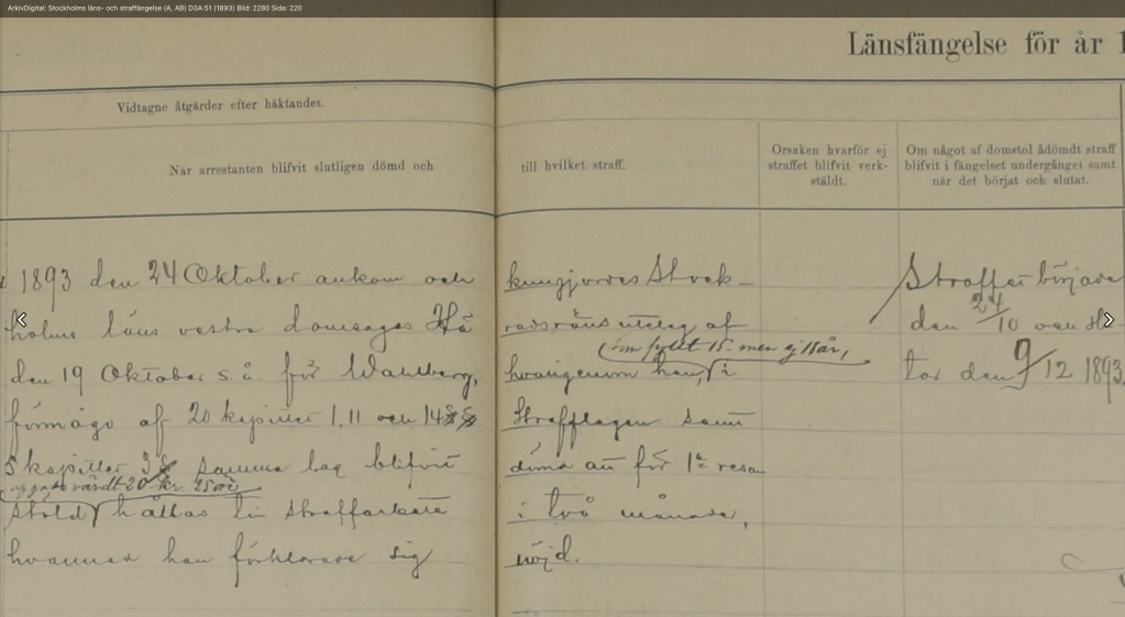 Av polisrapporten ser jag att han har suttit på Stockholms stads länsfängelse, vilka datum han varit fängslad och han har tjänat 3 kronor under sin vistelse där. Som framgår av bilden ovan finns han på ett ställe till i den här liggaren. Nu blev jag nyfiken.