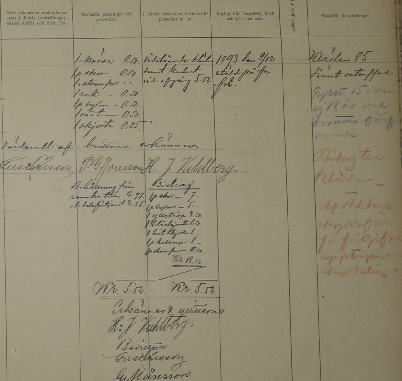 Vid frigivningen får han tillbaka kläderna han hade på sig vid inskrivningen som bestod av en mössa, en rock, ett par skor, ett par strumpor, ett par byxor, en skjorta och en väst, som tillsammans uppskattades vara värda 3,25 kronor. Han har tjänat in 5,52 kronor under fängelsetiden. Eftersom han är minderårig dvs mellan 15 och 18 år får han bidrag till en uppsättning nya kläder motsvarande 18,50 kronor. Nya skor, en ylletröja, som säkert kom väl till pass i december, två skjortor en blå och en vit, ett par kalsonger och ett par strumpor. Så han är bättre rustad när han släpps än när han kom in. Han har själv skrivit under att han mottagit allt detta, så nu har jag hans namnunderskrift också.