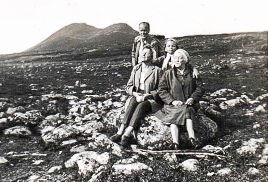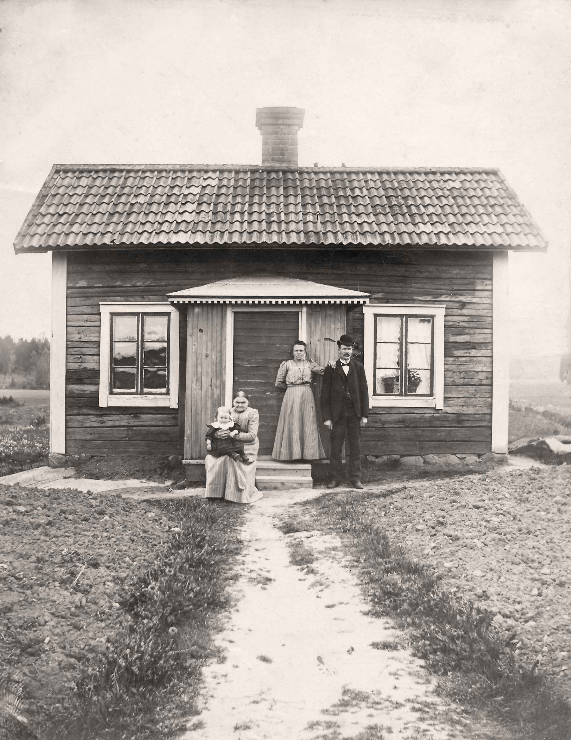 Mormor och morfar (enda kortet jag har på honom) och Sofia Bergvall med dottern Märta i knät, 1912 framför torpet