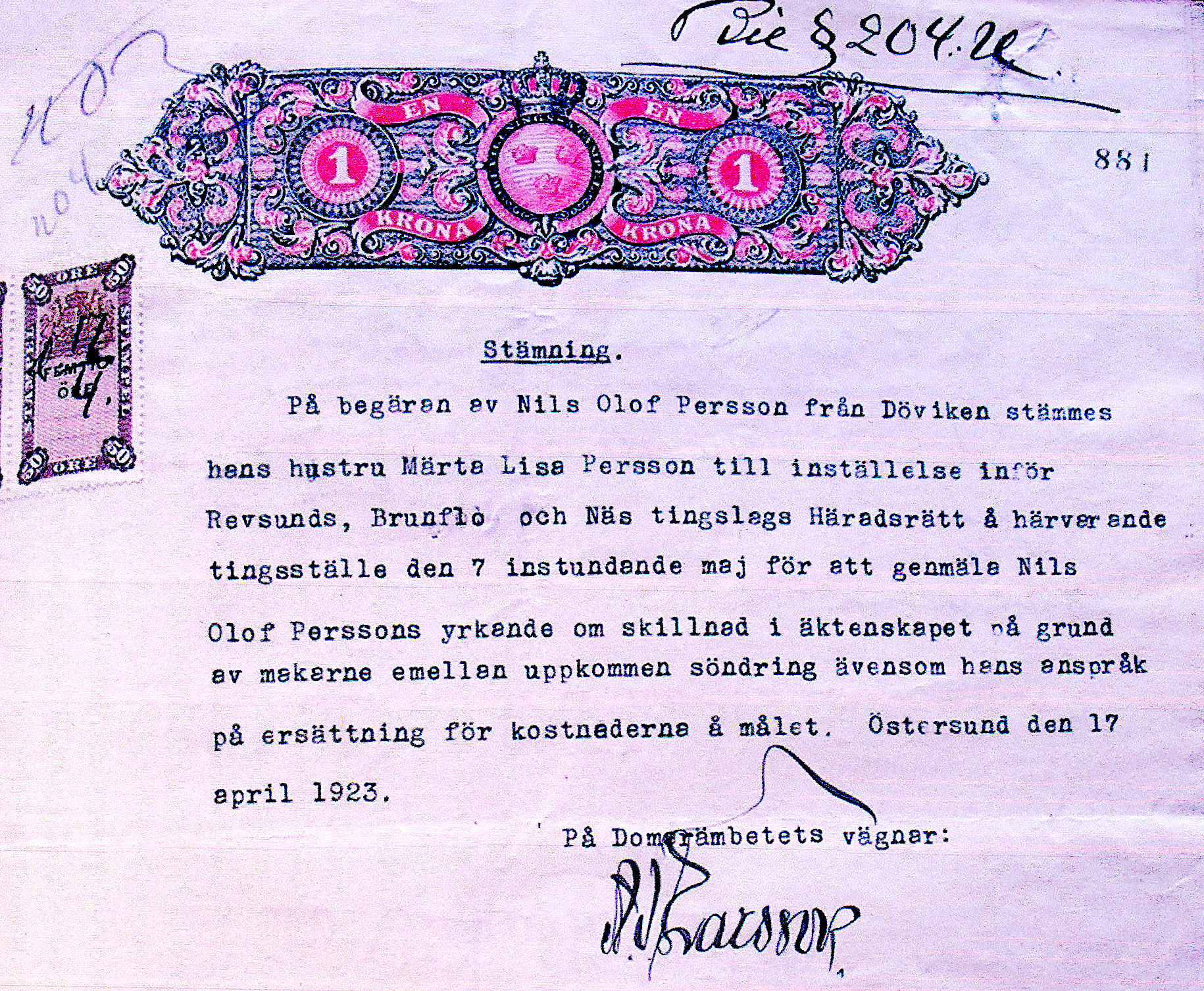 1921 lämnar Nils Olof in en stämning mot sin hustru Märta Lisa och begär samtidigt om skilsmässa. I de domstolsförhandlingar som sker företräds båda parter av ombud. Skilsmässoprocessen blir lång. Märta Lisa visar upp intyg från läkare om sitt psykiska och fysiska tillstånd som förklaring på varför hon inte ställer upp på de ”förhör”, de medlingstillfällen, hos kyrkoherden i Brunflo som domstolen kräver av henne. Prästen har hela tiden stött Nils Olof och Märta Lisa visar sin styrka, tycker jag, då hon vägrar medling. Hon kräver underhåll från sin make, men domstolen avslår hennes begäran. Bonden Håkansson, på vars mark Nils Olof har sin skogskoja, skriver till rätten att Nils Olof inte har medel att hjälpa sin hustru som tillsammans med deras dotter Brita bor kvar i Svedje.