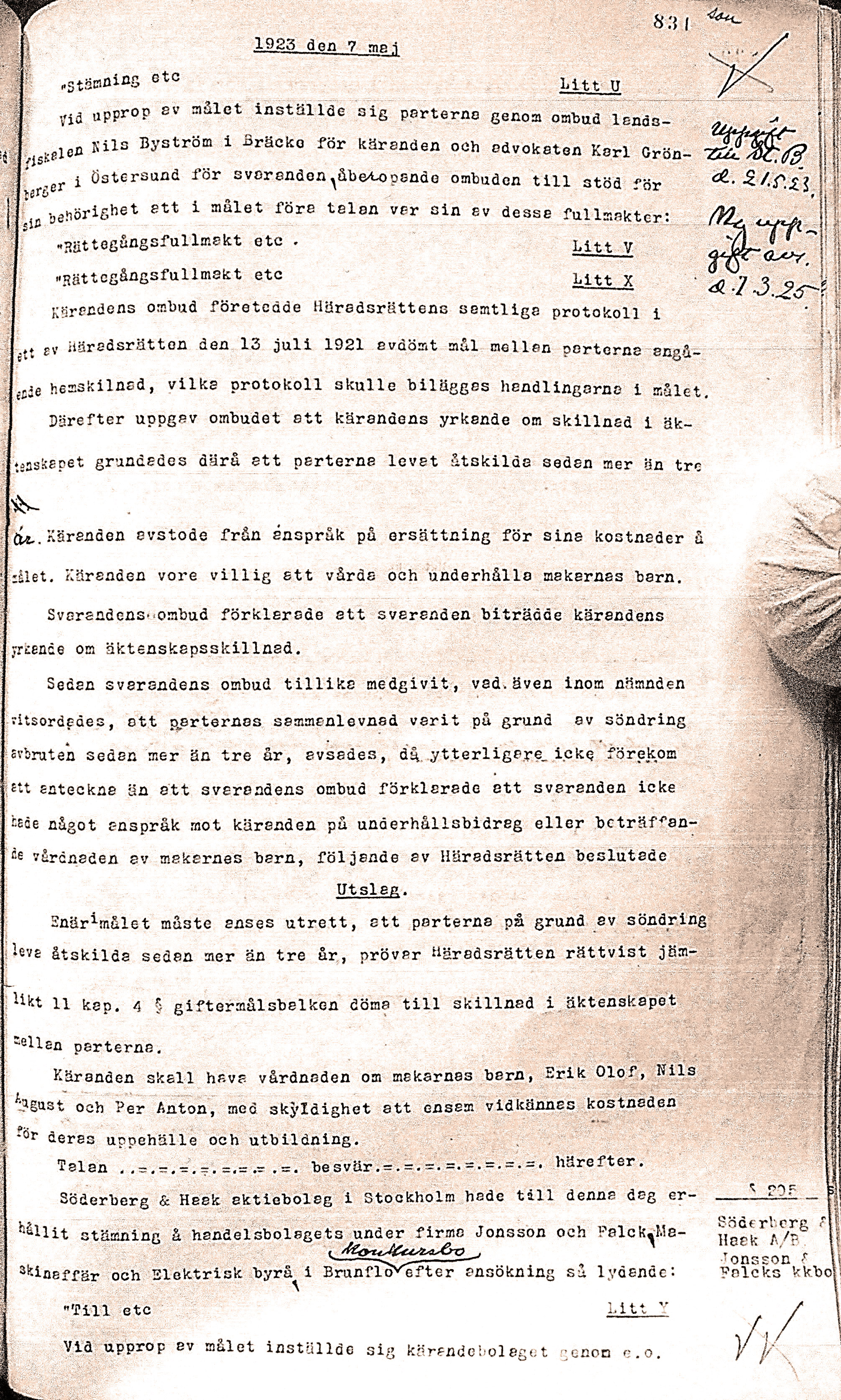 Det finns domstolsutdrag från fyra tillfällen då man behandlar frågan i rätten. Allt handlar om Märta och hennes vägran att fullfölja sin hustruroll. 1923 beslutar rätten om att äktenskapet skall upphöra. Nils Olof får ansvar för sönerna.