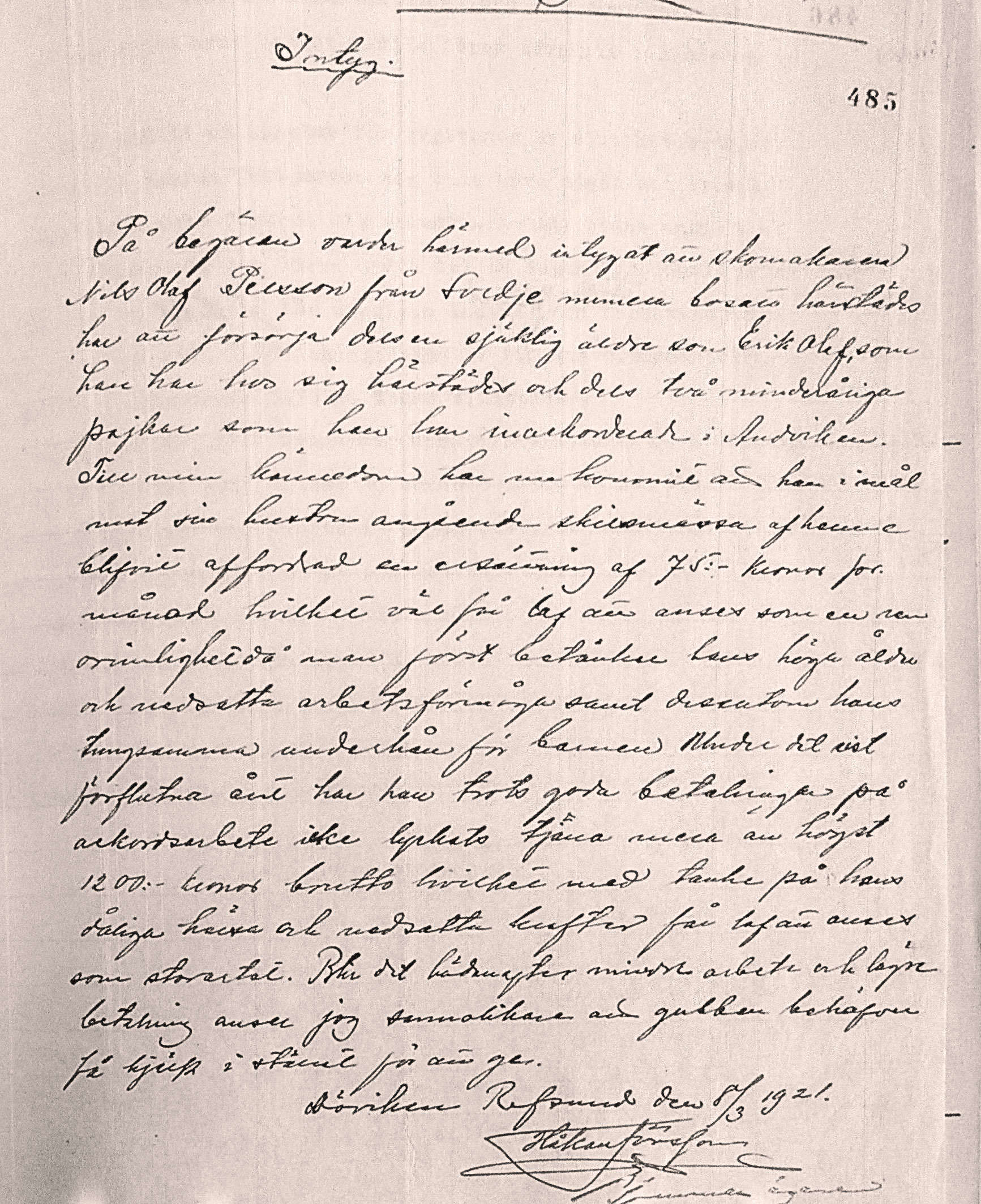 Nis Olof meddelar att han inte kan försörja sin yngste son, min far, som därför placeras på fattighuset i Revsund.. När Nils Olof dör 1928, 70 år gammal finns i bouppteckningen en summa av 12430 kronor som tillgångar. Från denna summa kräver Brunflo kommun 11200 kronor för omvårdnad av sönerna och 2000 kr ersättning för rättegången. Nils Olof begravning kostade 110 kronor. Det finns alltså inte en enda krona som arv till hans barn. Allt gick åt att betala för vård, skolgång, fostran av min far och hans bröder under åren 1915-1919 och för Per Anton under åren 1923-1927!